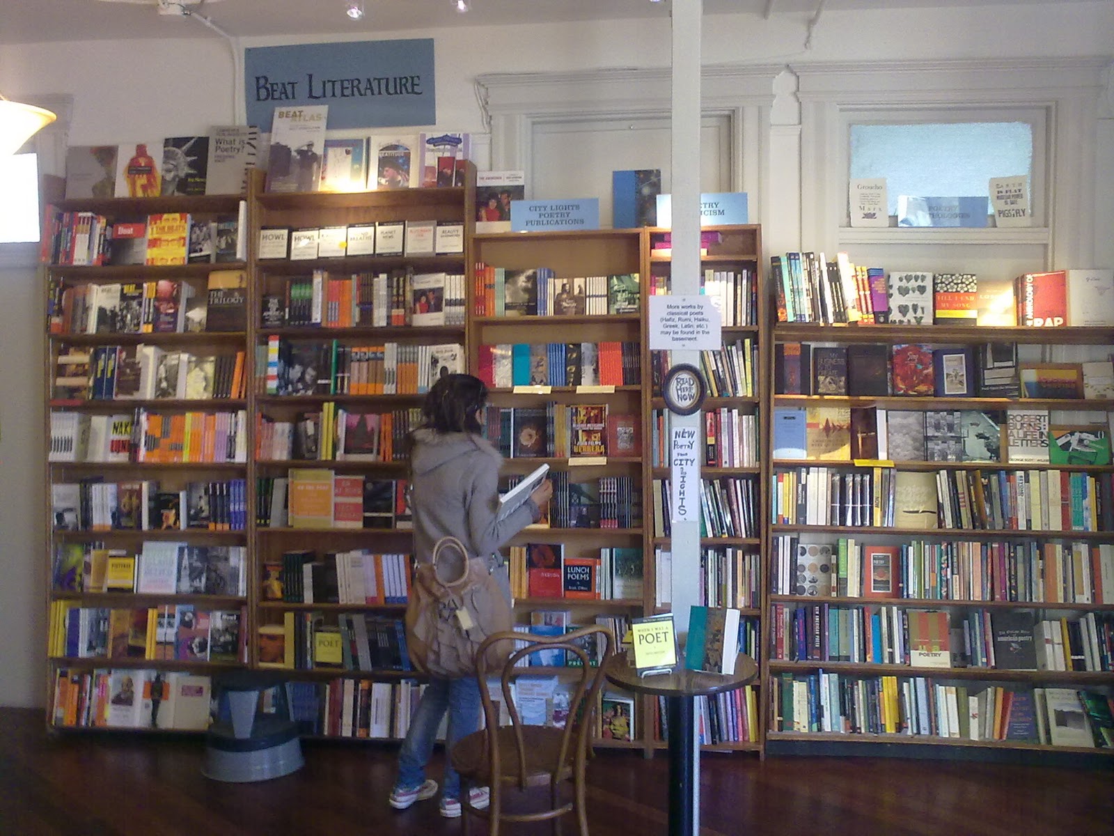 Akkurat her – i City Lights i San Francisco – føler jeg dette ekstra sterkt. Her oppsto beatlitteraturen. Skal vi være rause med beatgenerasjonens dophuer, knipset de borti vår kulturhistorie. Endret kanskje litt på den. Allen Ginsberg. William S. Burrough. Jack Kerouac. Lyrikere, forfattere og levemennesker som banet vei for en ny generasjon: hippiene. Opprøret. Fredsbevegelsen. Miljøbevegelsen. Bob Dylan var venn med Allen Ginsberg og lot seg inspirere både av Ginsberg og Kerouac (Ginsberg var med på Dylan-turnen «Rolling Thunder Revue» i 1975). Jim Morrison i The Doors viste til Kerouac som en av sine viktigste inspirasjonskilder. John Lennon og Paul McCartney (nettopp: fra the B e a t les) er blant mange som hentet inspirasjon fra den rastløse, opprørske beatgenerasjonen som våknet til liv i USA etter krigen. City Lights var bevegelsens litterære arnested. Lennon likte Kerouac. McCartney likte Ginsberg. Ja, så gode venner ble de at Paul McCartney spilte gitar på Ginsbergs «Ballad of the Skeletons». Sent i livet ble William S. Burroughs kompis med musikere som Mick Jagger, Lou Reed og Patti Smith.